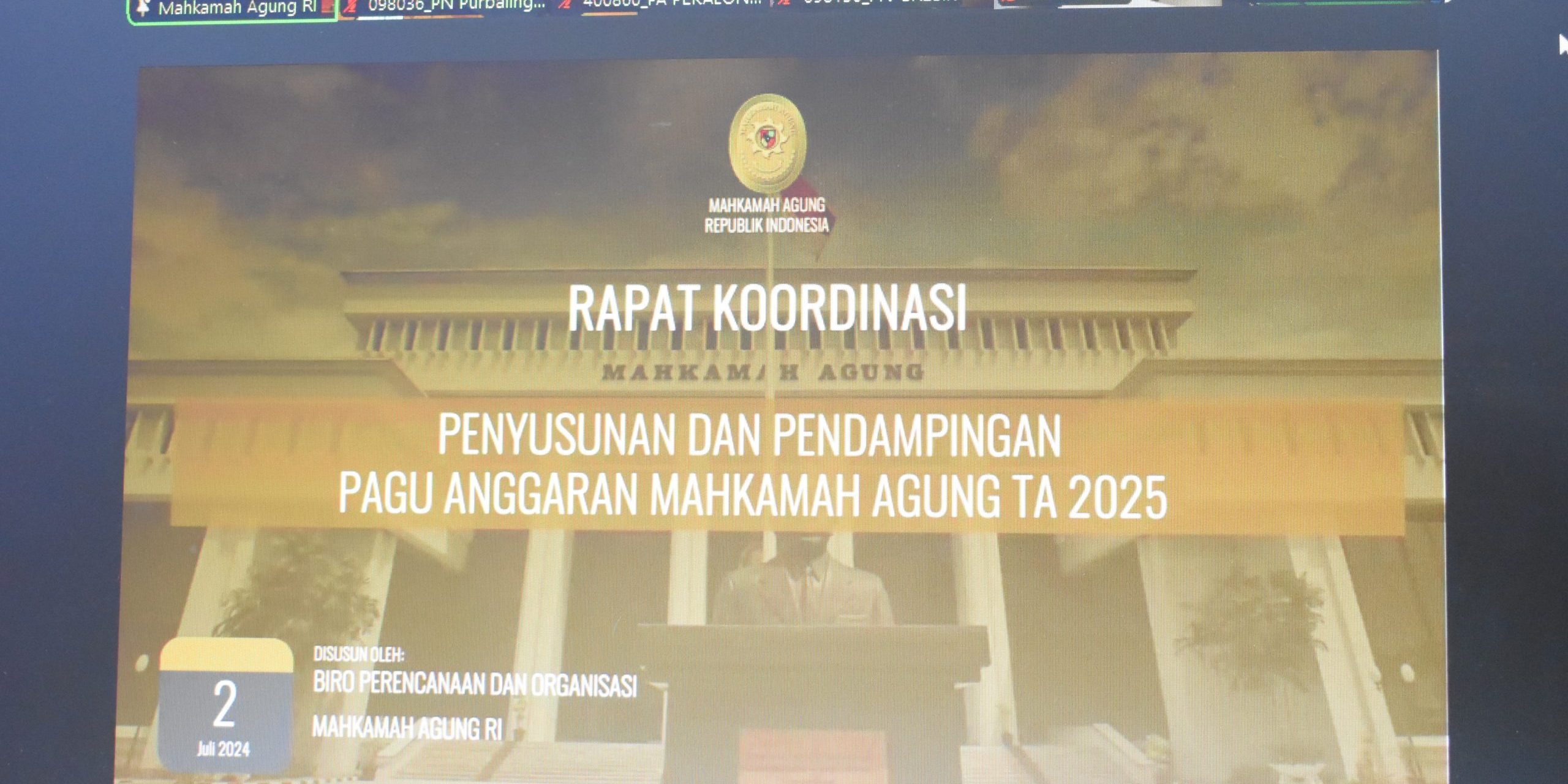 Pengadilan Negeri Purbalingga menghadiri undangan acara Persiapan Pelaksanaan Penyusunan dan Penampingan RKA-K/L Tahun Anggaran 2025 secara daring, Selasa (02/07/2024). Dipimpin oleh Sekretaris Pengadilan Negeri Purbalingga, Ibu Baiti Harfiah, S.H. dan diikuit pula oleh bagian PTIP Pengadilan Negeri Purbalingga yang dilaksanakan di Ruang Media Center Pengadilan Negeri Purbalingga.