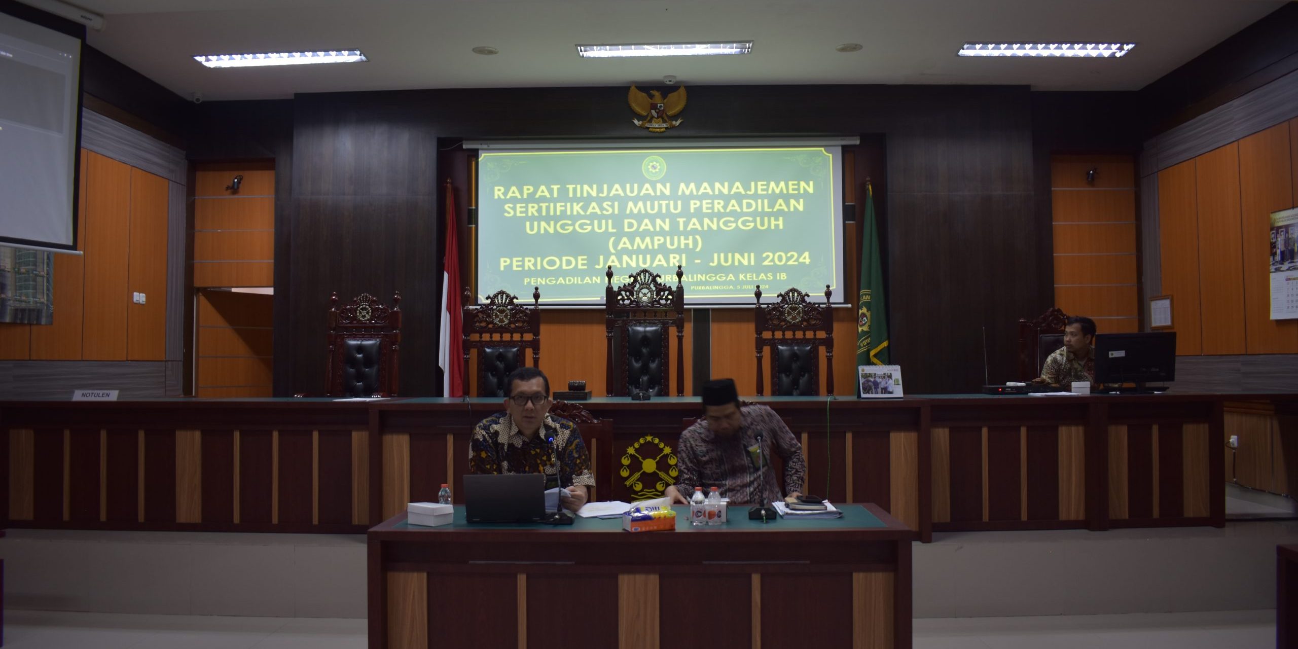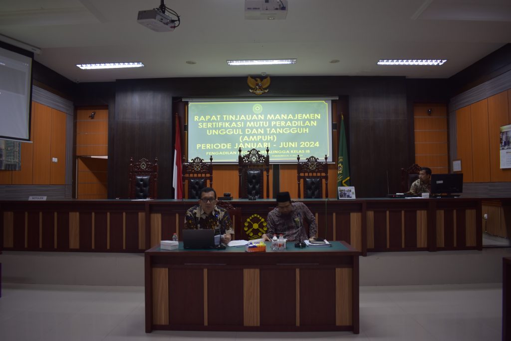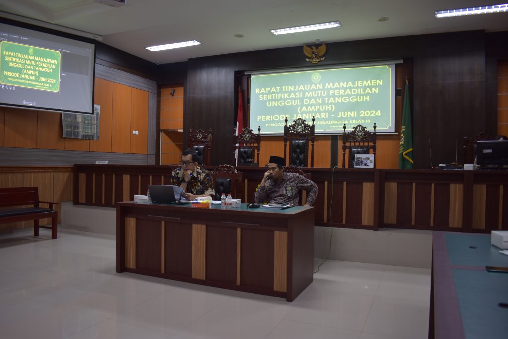Pengadilan Negeri Purbalingga melaksankan Rapat Tinjauan Manajemen Assesment Sertifikasi Mutu Peradilan Unggul dan Tangguh (AMPUH) periode Januari – Juni 2024, Jumat (05/07/2024). Acara berlangsung setelah acara Rapat Dinas Bulan Juli 2024. Dipimpin langsung oleh Ketua Pengadilan Negeri Purbalingga, Bapak Dr. Eko Julianto, S.H., M.M., M.H. serta diikuti pula oleh Wakil Ketua, Hakim, Panitera, Sekretaris, Pejabat Struktural dan Pejabat Fungsional, Pelaksana serta PPNPN Pengadilan Negeri Purbalingga yang dilaksanakan di Ruang Sidang Kartika Pengadilan Negeri Purbalingga.