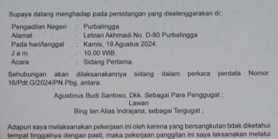 Panggilan Sidang Perdata Gugatan No.16/Pdt.G/2024/PN Pbg Atas Bing Ien Alias Indrajana yang semula beralamat di Dusun 2, Desa Tidu, Kecamatan Bukateja, Kabupaten Purbalingga untuk datang menghadiri sidang perdata yang akan dilaksanakan pada hari Kamis, 19 Agustus 2024 pukul 10.00 WIB berlokasi di Pengadilan Negeri Purbalingga.