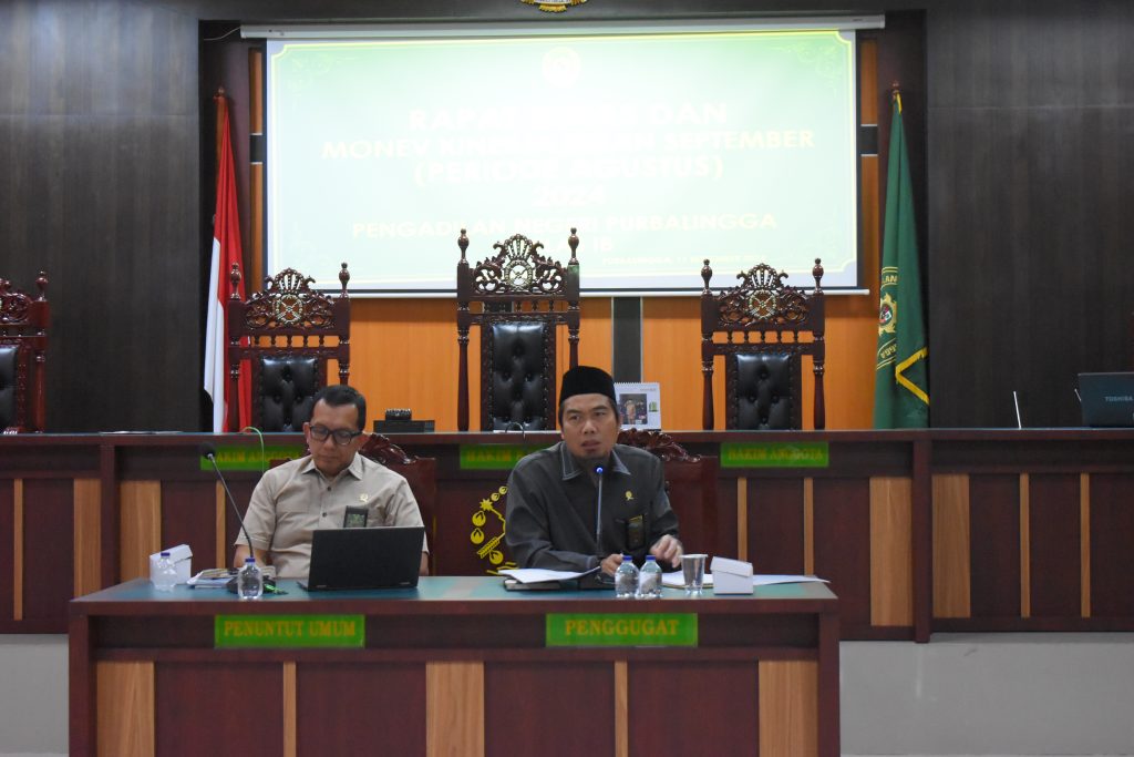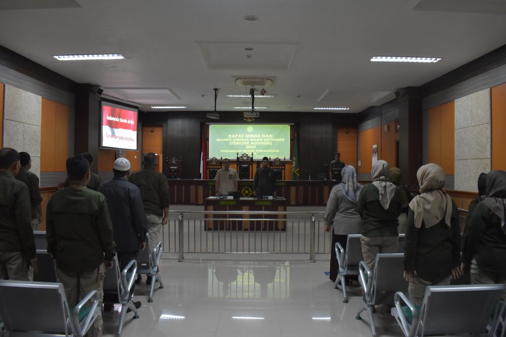 Pengadilan Negeri Purbalingga laksanakan Rapat Dinas Bulan September 2024 untuk periode Monitoring dan Evaluasi Bulan Agustus 2024 (11/09/2024) yang dipimpin langsung oleh Ketua Pengadilan Negeri Purbalingga, Bapak Dr. Eko Julianto, S.H., M.M., M.H. Rapat tersebut dilaksanakan di Ruang Sidang Kartika Pengadilan Negeri Purbalingga dengan diikuti oleh Wakil Ketua, Pejabat Struktural dan Fungsional, Pelaksana serta PPNPN Pengadilan Negeri Purbalingga.
