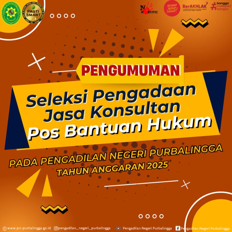 Dalam rangka percepatan Pelaksanaan Anggaran DIPA 03 Tahun 2025, Pengadilan Negeri Purbalingga akan melaksanakan Pengadaan Langsung untuk Paket Pekerjaan Pengadaan Jasa Konsultasi Lembaga Pemberi Layanan Bantuan Hukum pada Pos Bantuan Hukum Pengadilan Negeri Purbalingga Tahun Anggaran 2025. Informasi selengkapnya dapat dilihat dalam surat terlampir.