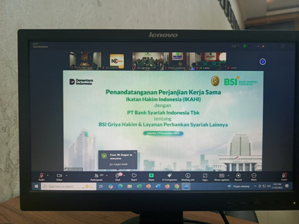 IKAHI PN Purbalingga ikuti Sosialisasi Program Kepemilikan Hunian Hakim dan Penandatangan MoU IKAHI – BSI secara daring (19/11/2025)