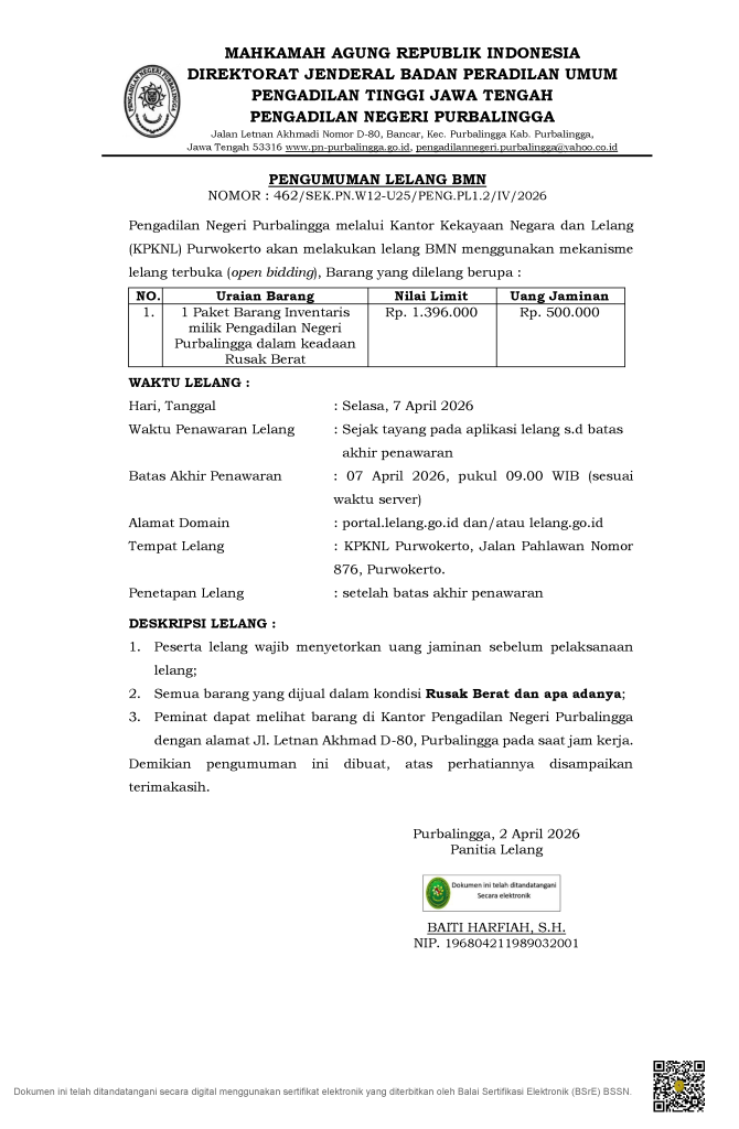 Pengadilan Negeri Purbalingga akan melaksanakan lelang inventaris Barang Milik Negara (BMN) melalui KPKNL Purwokerto.
