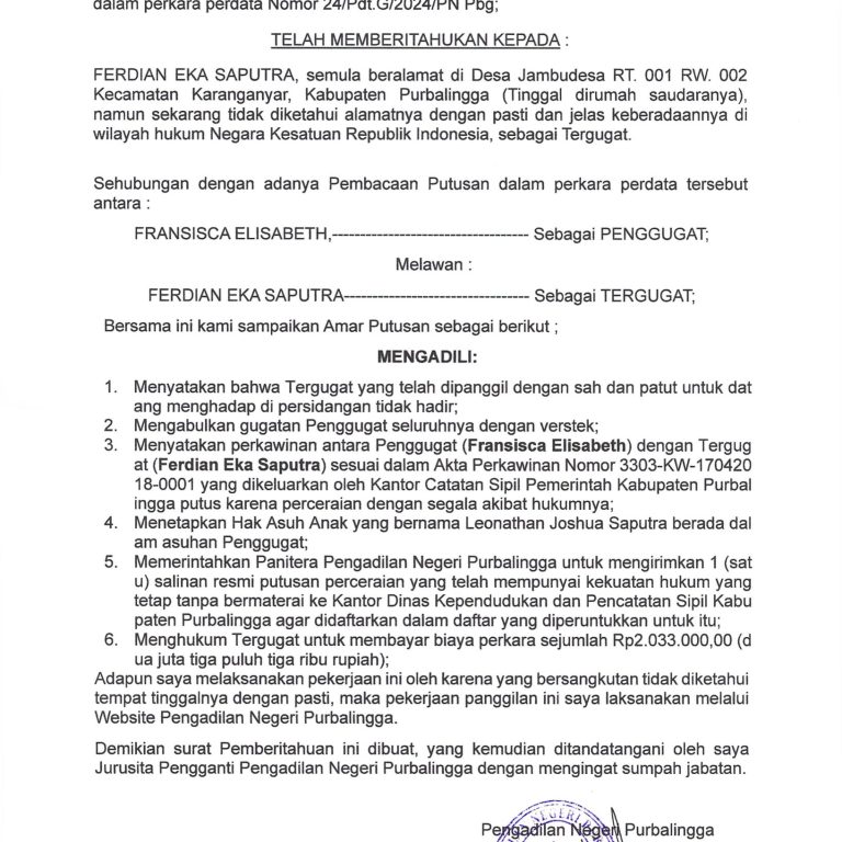 Pemberitahuan Putusan Perdata Gugatan No.24/Pdt.G/2024/PN Pbg Ferdian Ekas Saputra yang semula beralamat di Desa Jambudesa Rt.001/Rw.002, Kecamatan Karanganyar, Kabupaten Purbalingga, namun sekarang tidak diketahui alamat pasti dan jelas keberadaanya di wilayah hukum Negara Kesatuan Republik Indonesia.