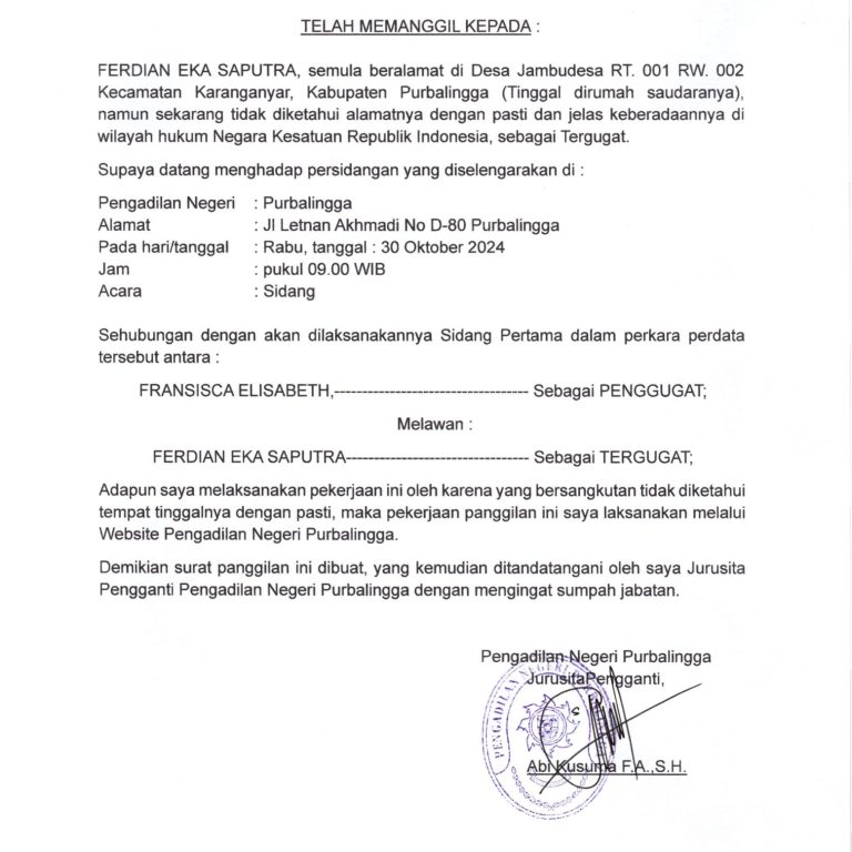 Panggilan Sidang Perdata Gugatan No.24/Pdt.G/2024/PN Pbg Atas Ferdian Eka Saputra yang semula beralamat di Desa Jambudesa Rt.001/Rw.002, Kecamatan Karanganyar, Kabupaten Purbalingga untuk datang menghadiri sidang perdata yang akan dilaksanakan pada hari Rabu, 30 Oktober 2024 pukul 09.00 WIB berlokasi di Pengadilan Negeri Purbalingga.