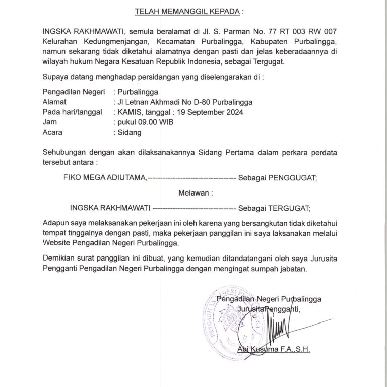 Panggilan Sidang Perdata Gugatan No.21/Pdt.G/2024/PN Pbg Atas Ingska Rakhmawati yang semula beralamat di Jl. S. Parman No.77, t.003/ Rw.007, Kelurahan Kedungmenjangan, Kecamatan Purbalingga, Kabupaten Purbalingga untuk datang menghadiri sidang perdata yang akan dilaksanakan pada hari Kamis, 19 September 2024 pukul 10.00 WIB berlokasi di Pengadilan Negeri Purbalingga.