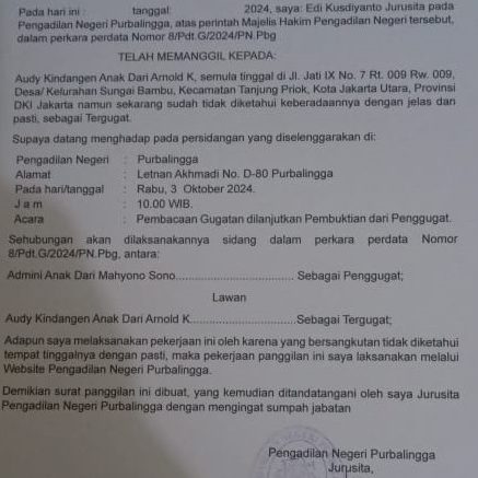 Panggilan Sidang Perdata Gugatan No.8/Pdt.G/2024/PN Pbg Atas Audy Kindangan anak dari Arnold K