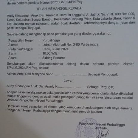 Panggilan Sidang Perdata Gugatan No.8/Pdt.G/2024/PN Pbg Atas Nama Audy Kindangan Anak dari Arlnold K.