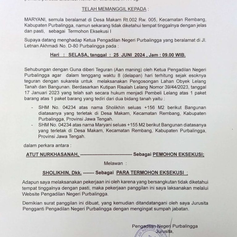 Panggilan Sidang Perdata Eksekusi No.2/Pdt.Eks/2024/PN Pbg Atas Nama Maryani